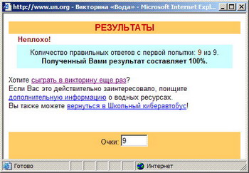 На сайте Международного 10-летия действий «Вода для жизни» (2005–2015 годы) ООН (Организация Объединенных Наций) создала Детский уголок (http://www.un.org/russian/waterforlifedecade/educationandyouth.html). На этой страничке опубликована викторина-игра «Школьный киберавтобус», путешествие на котором знакомит с участием воды в повседневной жизни человека http://www.un.org/russian/cyberschoolbus/games/waterquiz/index.asp. Предлагаем вам отправиться в это путешествие и, пройдя все вопросы викторины, сообщить нам о том, что вам удалось узнать. А может, вы также сумеете сделать рекламу этого путешествия для своих друзей и других детей Беларуси?